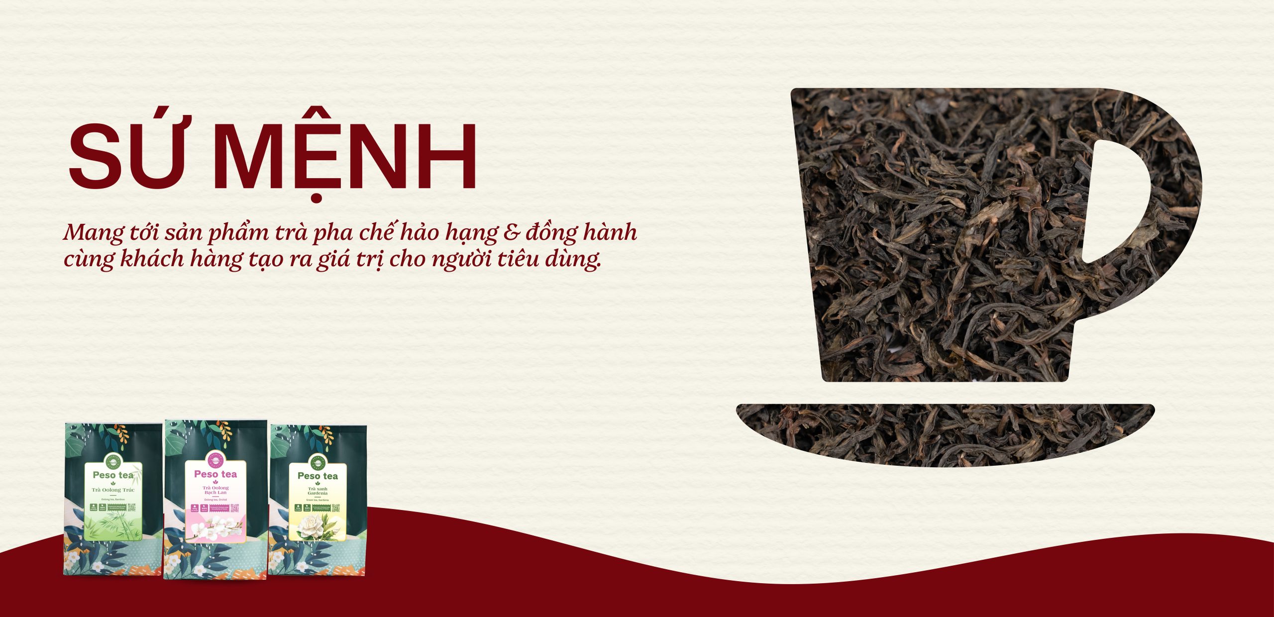 Tại PESO TEA, tình yêu trà Việt là khởi nguồn, được vun vén qua từng búp trà, đi qua đam mê, thấu hiểu, hoà nhịp thời đại để tạo nên những ly đồ uống đậm sắc vị, hài hoà hương. Từ đó kiến tạo giá trị độc bản, thượng hạng và nâng tầm di sản văn hoá trà trong cuộc sống hiện đại.